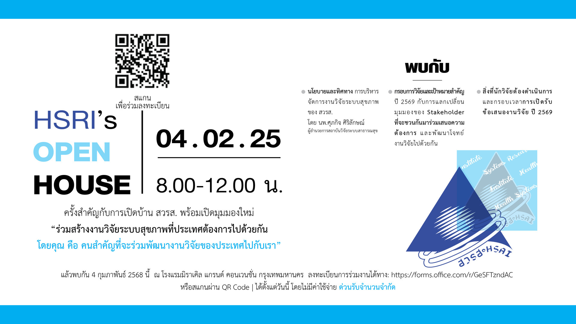 นพ.ศุภกิจ กล่าวต่อว่า อย่างไรก็ตาม การได้มาซึ่งผลงานวิชาการที่มีประสิทธิภาพและสามารถตอบโจทย์ต่อปัญหาได้จริงก็ไม่ใช่เรื่องง่าย และ สวรส. ในฐานะคลังสมองของประเทศด้านระบบสาธารณสุขก็ไม่สามารถขับเคลื่อนให้บรรลุเป้าหมายได้เพียงลำพัง แต่ต้องอาศัยความร่วมมือจากผู้เกี่ยวข้องทุกภาคส่วน ทั้งนักวิจัย ภาคประชาสังคม และผู้กำหนดนโยบาย ฯลฯ สวรส. จึงอยากเชิญชวนให้ทุกคนมาร่วมงานเปิดบ้าน สวรส. “HSRI’s Open House” ที่จะจัดขึ้นในวันที่ 4 ก.พ.นี้ ภายใต้ธีม “ร่วมสร้างงานวิจัยระบบสุขภาพที่ประเทศต้องการไปด้วยกัน โดยคุณคือคนสำคัญที่จะร่วมพัฒนางานวิจัยของประเทศไปกับเรา” ซึ่งเป็นเวทีที่ สวรส. จัดขึ้นเพื่อนำเสนอนโยบายและทิศทางการบริหารจัดการงานวิจัยระบบสาธารณสุขของ สวรส. ตลอดจนเป้าหมายสำคัญในปี 2569 และที่สำคัญคือการแลกเปลี่ยนมุมมองจากนักวิจัย และผู้ที่เกี่ยวข้องถึงกรอบทิศทางวิจัยที่ต้องการ เพื่อการสนับสนุนของ สวรส. จะได้สอดคล้องกับความต้องการและปัญหาสำคัญของประเทศ ตลอดจนเพื่อนำงานวิจัยไปใช้ประโยชน์ในการพัฒนาระบบสาธารณสุขของประเทศได้ต่อไป