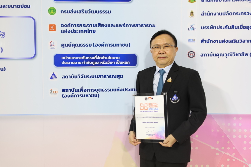 27 .. 2567: สถาบันวิจัยระบบสาธารณสุข สวรส. นำโดย นพ.ศุภกิจ ศิริลักษณ์ ผู้อำนวยการ สวรส. เข้าร่วมในงานพิธีมอบรางวัลรัฐบาลดิจิทัล ประจำปี 2567 “DG Awards 2024” โดย สวรส. คว้ารางวัลรัฐบาลดิจิทัล ประจำปี 2567 DG Awards 2024 รางวัลพัฒนาการดีเด่น: หน่วยงานระดับกรมที่จัดทำนโยบาย ประสานงาน กำกับดูแล หรืออื่นๆ เป็นหลัก