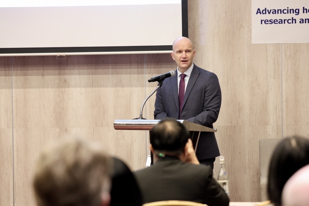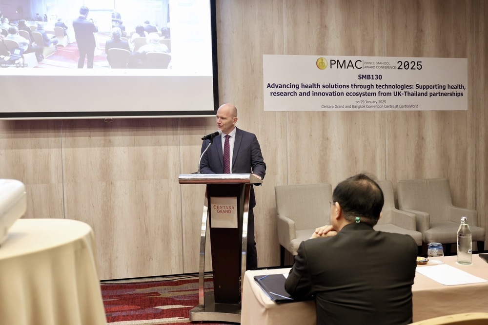 นายเดวิด โธมัส (David Thomas) อุปทูตรักษาการแทนเอกอัครราชทูตสหราชอาณาจักรประจำประเทศไทย กล่าวเปิดการประชุมว่า สหราชอาณาจักรและไทยมีความร่วมมือกันมายาวนานในด้านวิทยาศาสตร์ชีวการแพทย์และการวิจัยด้านสุขภาพ ซึ่งรวมถึงการจัดหาเงินทุนสำหรับโครงการ ทุนการศึกษา ฯลฯ นอกจากนี้ ในปี 2567 สหราชอาณาจักรยังเป็นประเทศในทวีปยุโรปประเทศแรกที่ยกระดับความสัมพันธ์กับไทยให้เป็นหุ้นส่วนทางยุทธศาสตร์ โดยความร่วมมือนี้มีแผนงานที่เน้นย้ำถึงความมุ่งมั่นร่วมกันในการพัฒนาด้านสุขภาพในระดับโลก ผ่านการสนับสนุนการเข้าถึงการดูแลสุขภาพอย่างทั่วถึง และการเสริมสร้างความร่วมมือเพื่อป้องกันภัยคุกคามสุขภาพระดับโลก ตั้งแต่การรับมือกับการดื้อยาต้านจุลชีพ การระบาดของโรคติดเชื้อ ไปจนถึงการพัฒนาและการประยุกต์ใช้เทคโนโลยีนวัตกรรม เช่น จีโนมิกส์ ฯลฯ