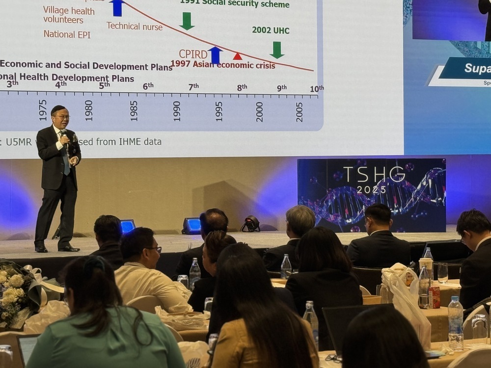 ทั้งนี้ในการประชุมฯ นพ.ศุภกิจ ศิริลักษณ์ ผู้อำนวยการสถาบันวิจัยระบบสาธารณสุข ได้ร่วมบรรยายในหัวข้อ “Genomics Thailand Phase 2 โดยได้พูดถึงระบบสาธารณสุขของประเทศในช่วงเริ่มต้นว่า ระบบสาธารณสุขประเทศไทยอยู่ในระดับแนวหน้าของโลก ซึ่งเทียบเท่ากับประเทศที่พัฒนาแล้ว เช่น สหรัฐอเมริกา โดยวัดจาก Life expectancy หรือ อายุโดยเฉลี่ยของประชากรที่คาดว่าจะมีชีวิตอยู่ ซึ่งเมื่อเทียบ Life expectancy ระหว่างไทยกับสหรัฐอเมริกานั้น มีจำนวนปีของ Life expectancy ที่ใกล้เคียงกันมาก แต่จำนวนงบประมาณแตกต่างกันอย่างสิ้นเชิง ซึ่งในส่วนของประเทศไทยมีการลงทุนตั้งแต่ด้านโครงสร้างพื้นฐาน เช่น ศูนย์อนามัยประจำตำบล โรงพยาบาลชุมชน โรงพยาบาลศูนย์ ฯลฯ ด้านบุคลากรมีการผลิตแพทย์และพยาบาลเพิ่มขึ้นเรื่อยมา และเพื่อให้ประชาชนสามารถเข้าถึงบริการสุขภาพได้อย่างทั่วถึงและเท่าเทียม จึงมีการประกาศใช้ระบบหลักประกันสุขภาพถ้วนหน้า หรือ Universal Health Coverage: UC ซึ่งสิ่งเหล่านี้ประเทศไทยดำเนินการมาตั้งแต่ประเทศยังมีรายได้น้อย และหลายประเทศอาจมองว่าไทยยังไม่มีศักยภาพทำได้ จนปัจจุบันสาธารณสุขไทยอยู่อันดับเดียวกับประเทศที่พัฒนาแล้ว ดังนั้นการเริ่มลงทุนกับสิ่งที่เราเชื่อว่าจะสามารถพัฒนาประเทศได้ ถึงแม้อาจยังอยู่ในสถานะที่ไม่พร้อม แต่เราควรเริ่มตั้งแต่วันนี้ เพื่อผลลัพธ์ที่จะได้มากกว่าในระยะยาว