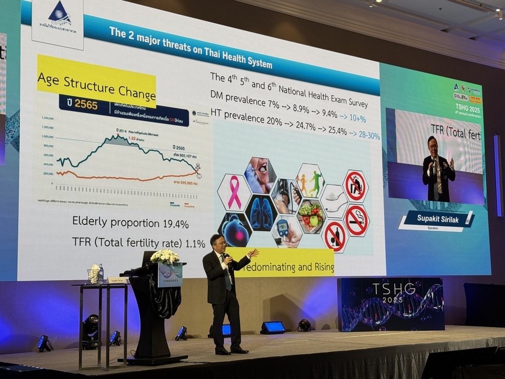 สมาคมมนุษยพันธุศาสตร์ ร่วมกับสถาบันวิจัยระบบสาธารณสุข (สวรส.) และภาคีเครือข่าย จัดประชุมวิชาการประจำปี ครั้งที่ 4 ภายใต้หัวข้อ “Genomics Thailand in Action: Transforming Healthcare in Thailand” ระหว่างวันที่ 30 เม.ย. - 2 พ.ค. 2568 เพื่อแสดงพลังขับเคลื่อนการประยุกต์ใช้เทคโนโลยีจีโนมิกส์ ภายใต้แผนปฏิบัติการบูรณาการจีโนมิกส์ประเทศไทยฯ เพื่อการเปลี่ยนแปลงระบบการดูแลสุขภาพของประเทศ โดยภายในงานได้รับเกียรติจาก นพ.เกษม ตั้งเกษมสำราญ ผู้แทนปลัดกระทรวงสาธารณสุข ผู้ทรงคุณวุฒิด้านควบคุมป้องกันโรคนายแพทย์ทรงคุณวุฒิ ร่วมกับ นพ.ศุภกิจ ศิริลักษณ์ ผู้อำนวยการสถาบันวิจัยระบบสาธารณสุข และ นพ.จักรกฤษณ์ เอื้อสุนทรวัฒนา นายกสมาคมมนุษยพันธุศาสตร์ ตลอดจนผู้แทนจากหน่วยงานภาครัฐและเอกชนที่เกี่ยวข้องร่วมเป็นเกียรติในพิธีเปิดการประชุมฯ เมื่อวันที่ 30 เม.ย. 2568 ที่ผ่านมา ณ โรงแรมพูลแมน คิง เพาเวอร์