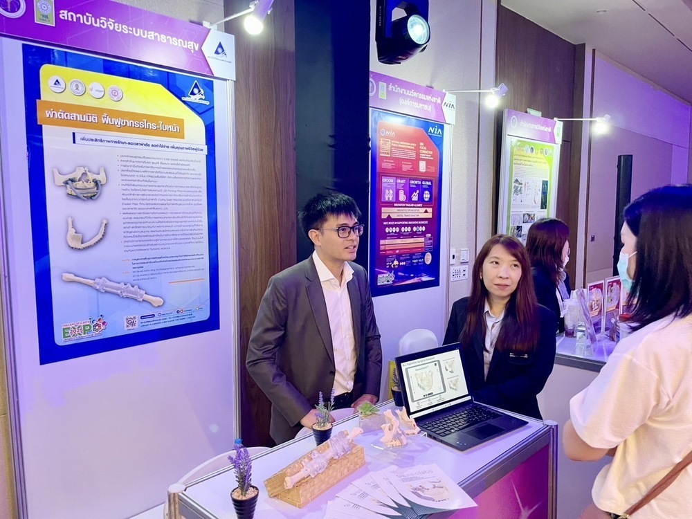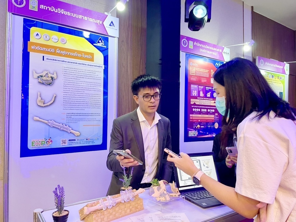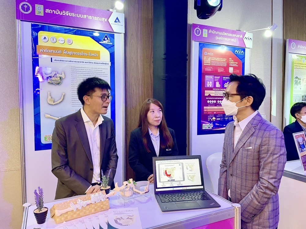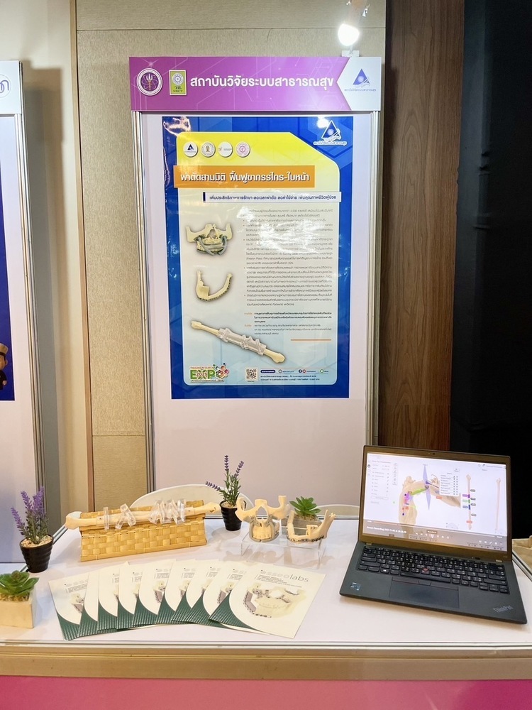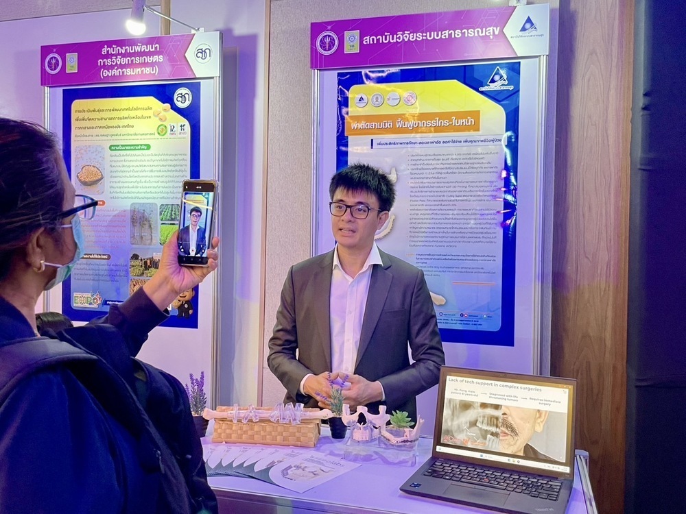 ด้านสถาบันวิจัยระบบสาธารณสุข (สวรส.) หนึ่งในเครือข่ายหน่วยงานบริหารและจัดการทุนวิจัย (PMU) นำผลงานวิจัยเด่น “การบูรณาการฟื้นฟูขากรรไกรและใบหน้าแบบครอบคลุมโดยการใช้ตำแหน่งฟันเทียมร่วมในการวางแผนผ่าตัดเสมือนจริงด้วยโปรแกรมคอมพิวเตอร์และอุปกรณ์ช่วยผ่าตัดเฉพาะบุคคล” ร่วมจัดแสดง ซึ่งเป็นวิจัยนวัตกรรมที่ช่วยเพิ่มประสิทธิภาพการรักษา และเพิ่มคุณภาพชีวิตให้กับผู้ป่วยมะเร็งช่องปาก โดยผลงานวิจัยชิ้นนี้ได้ทีมวิจัยไฟแรงทั้งทันตแพทย์ ศัลยแพทย์พลาสติก และวิศวกร ร่วมกันสร้างสรรค์ผลงานวิจัยที่ตอบโจทย์การแก้ปัญหาการรักษาผู้ป่วยมะเร็งช่องปาก ซึ่งปัจจุบันประเทศไทยพบผู้ป่วยมะเร็งช่องปากมากกว่า 4,000 รายต่อปี และมีแนวโน้มเพิ่มขึ้นทุกปี โดยสาเหตุสำคัญมาจากการดื่มสุรา สูบบุหรี่ เคี้ยวหมาก และติดเชื้อไวรัสเอชพีวี ทั้งนี้การรักษาจำเป็นต้องได้รับการผ่าตัดขากรรไกรและทดแทนด้วยกระดูกของบริเวณอื่น ซึ่งเป็นการผ่าตัดที่มีความซับซ้อน และประเทศไทยมีโรงพยาบาลที่สามารถทำการผ่าตัดดังกล่าวได้ค่อนข้างจำกัด รวมทั้งการผ่าตัดใช้เวลานานกว่า 10 ชั่วโมง ทำให้ผู้ป่วยฟื้นตัวได้ช้า มีความเสี่ยงต่อการเกิดภาวะแทรกซ้อน และส่งผลต่อค่ารักษาที่เพิ่มขึ้นตามมา