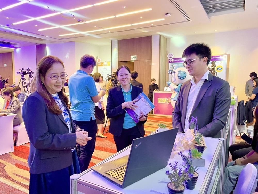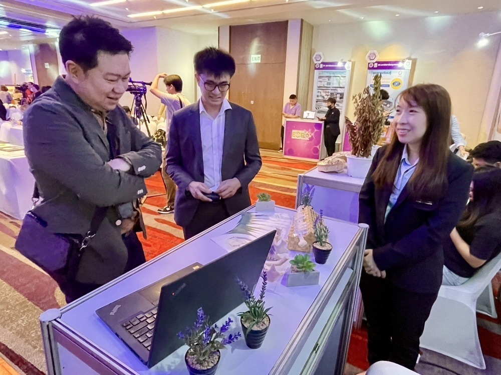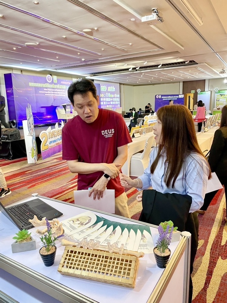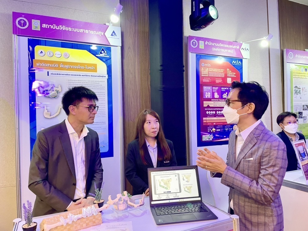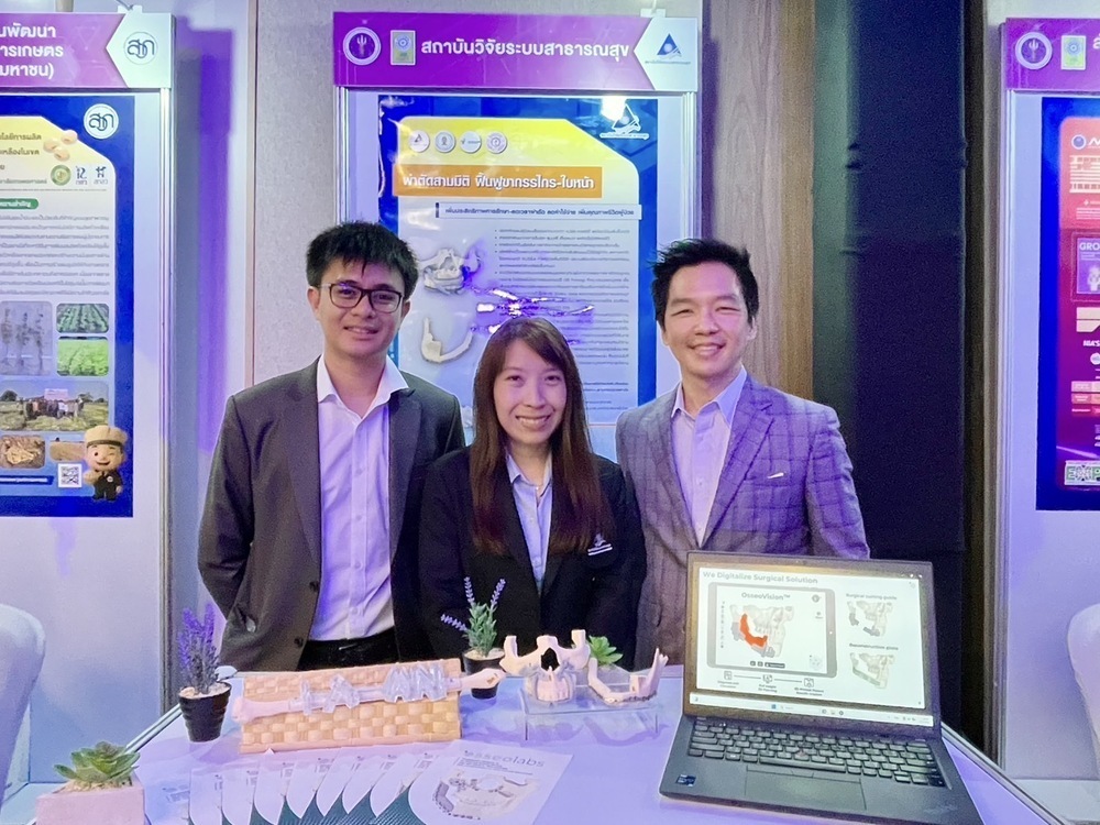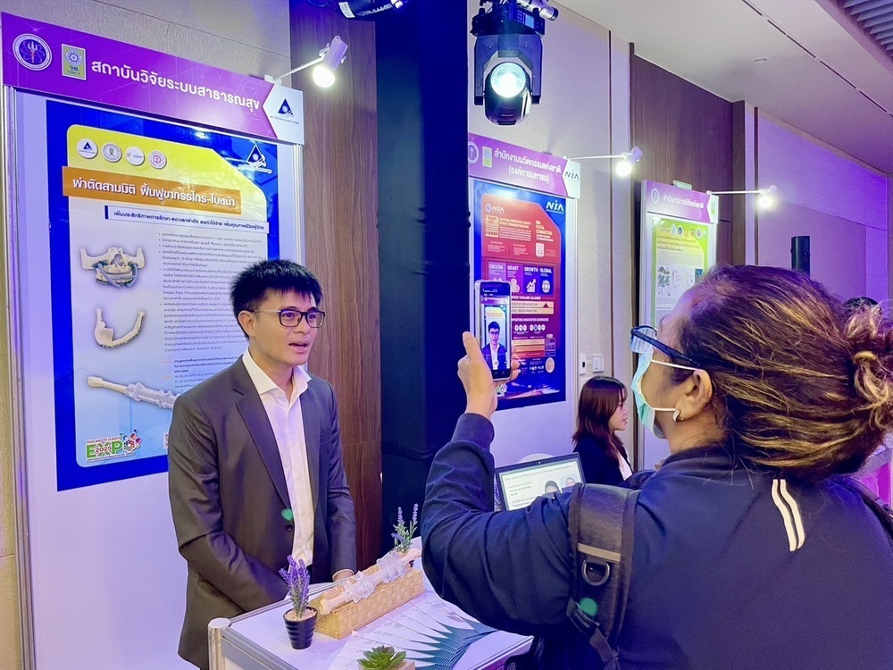 ด้านสถาบันวิจัยระบบสาธารณสุข (สวรส.) หนึ่งในเครือข่ายหน่วยงานบริหารและจัดการทุนวิจัย (PMU) นำผลงานวิจัยเด่น “การบูรณาการฟื้นฟูขากรรไกรและใบหน้าแบบครอบคลุมโดยการใช้ตำแหน่งฟันเทียมร่วมในการวางแผนผ่าตัดเสมือนจริงด้วยโปรแกรมคอมพิวเตอร์และอุปกรณ์ช่วยผ่าตัดเฉพาะบุคคล” ร่วมจัดแสดง ซึ่งเป็นวิจัยนวัตกรรมที่ช่วยเพิ่มประสิทธิภาพการรักษา และเพิ่มคุณภาพชีวิตให้กับผู้ป่วยมะเร็งช่องปาก โดยผลงานวิจัยชิ้นนี้ได้ทีมวิจัยไฟแรงทั้งทันตแพทย์ ศัลยแพทย์พลาสติก และวิศวกร ร่วมกันสร้างสรรค์ผลงานวิจัยที่ตอบโจทย์การแก้ปัญหาการรักษาผู้ป่วยมะเร็งช่องปาก ซึ่งปัจจุบันประเทศไทยพบผู้ป่วยมะเร็งช่องปากมากกว่า 4,000 รายต่อปี และมีแนวโน้มเพิ่มขึ้นทุกปี โดยสาเหตุสำคัญมาจากการดื่มสุรา สูบบุหรี่ เคี้ยวหมาก และติดเชื้อไวรัสเอชพีวี ทั้งนี้การรักษาจำเป็นต้องได้รับการผ่าตัดขากรรไกรและทดแทนด้วยกระดูกของบริเวณอื่น ซึ่งเป็นการผ่าตัดที่มีความซับซ้อน และประเทศไทยมีโรงพยาบาลที่สามารถทำการผ่าตัดดังกล่าวได้ค่อนข้างจำกัด รวมทั้งการผ่าตัดใช้เวลานานกว่า 10 ชั่วโมง ทำให้ผู้ป่วยฟื้นตัวได้ช้า มีความเสี่ยงต่อการเกิดภาวะแทรกซ้อน และส่งผลต่อค่ารักษาที่เพิ่มขึ้นตามมา