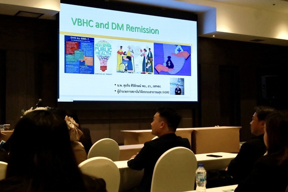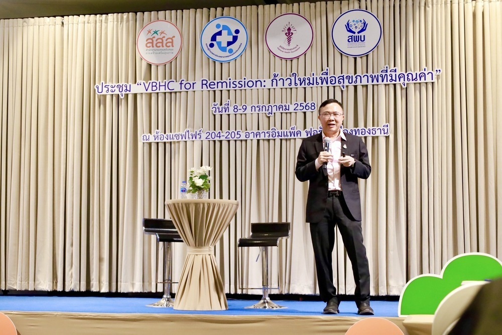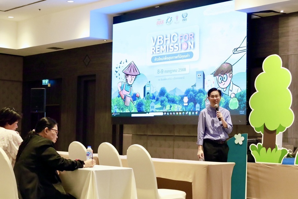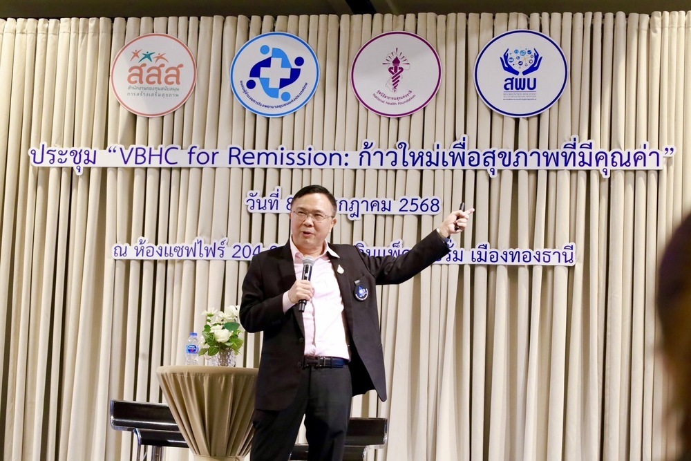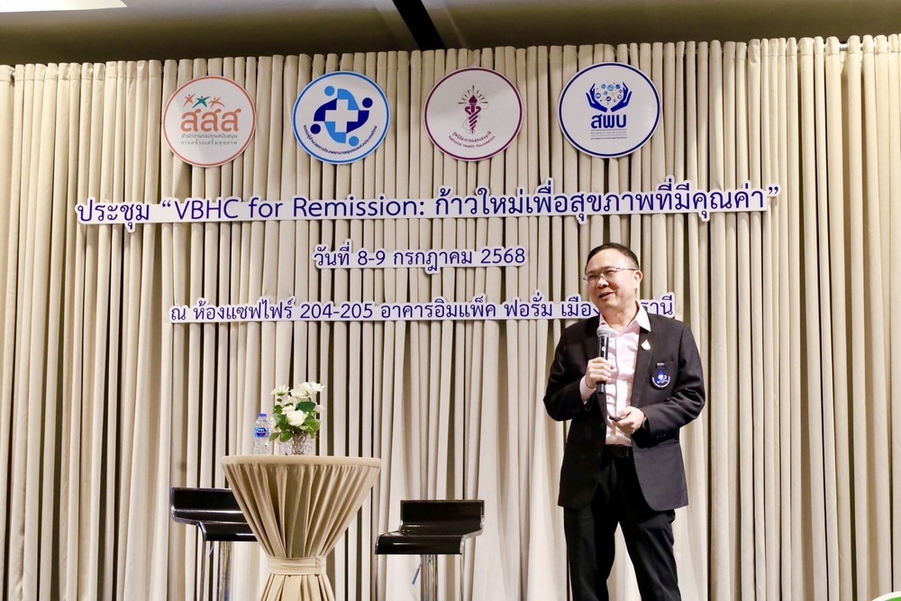 นพ.ศุภกิจ ศิริลักษณ์ ผู้อำนวยการสถาบันวิจัยระบบสาธารณสุข เปิดการประชุม "VBHC for Remission: ก้าวใหม่เพื่อสุขภาพที่มีค่า” พร้อมบรรยายพิเศษหัวข้อ “VBHC ทางออกของระบบสุขภาพไทย กับ DM Remission” ซึ่งเป็นการประชุมภายใต้โครงการพัฒนาศูนย์รียนรู้เพื่อการขยายผลในโรงพยาบาลชุมชนและศูนย์สุขภาพชุมชนเขตเมือง เพื่อส่งเสริมการปรับเปลี่ยนพฤติกรรมสุขภาพสำหรับผู้ป่วยเบาหวาน โดยเน้นภาวะโรคสงบ (DM Remission) และการควบคุมน้ำหนักตัว บนฐานแนวคิดการจัดบริการแบบมุ่งเน้นคุณค่า (Value-based Health Care: VBHC) ที่เน้นผลลัพธ์ที่ดีเมื่อเทียบกับต้นทุน และสนับสนุนให้ผู้ป่วยจัดการสุขภาพด้วยตนเอง โดยมีผู้เข้าร่วมประชุมกว่า 200 คน จากโรงพยาบาลเครือข่ายจำนวน 45 แห่ง รวมทั้งมีโรงพยาบาลต้นแบบเรื่อง DM Remission ร่วมแบ่งปันประสบการณ์และจุดประกายแนวทางสร้างการดูแลเบาหวานแนวใหม่ เช่น รพ.สมเด็จพระยุพราชกระนวน จ.ขอนแก่น รพ.บางบางระกำ จ.พิษณุโลก รพ.เพชรบูรณ์ รพ.กาญจนดิษฐ์ จ.สุราษฎร์ธานี รพ.ท่าวุ้ง จ.ลพบุรี ฯลฯ เมื่อวันที่ 8 ก.ค. 2568 ณ ห้องแซฟไฟร์ 204-205 อาคารอิมแพ็ค ฟอรั่ม เมืองทองธานี