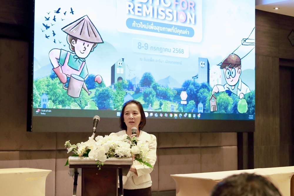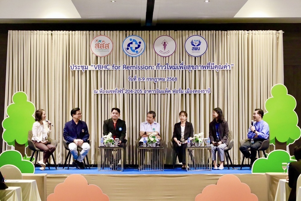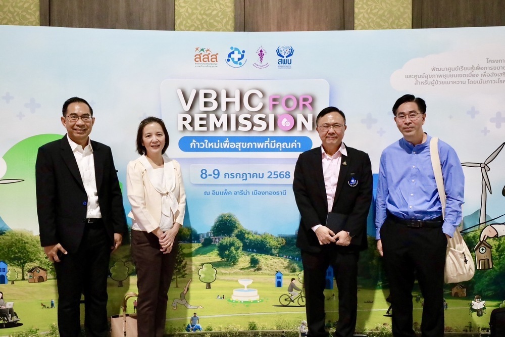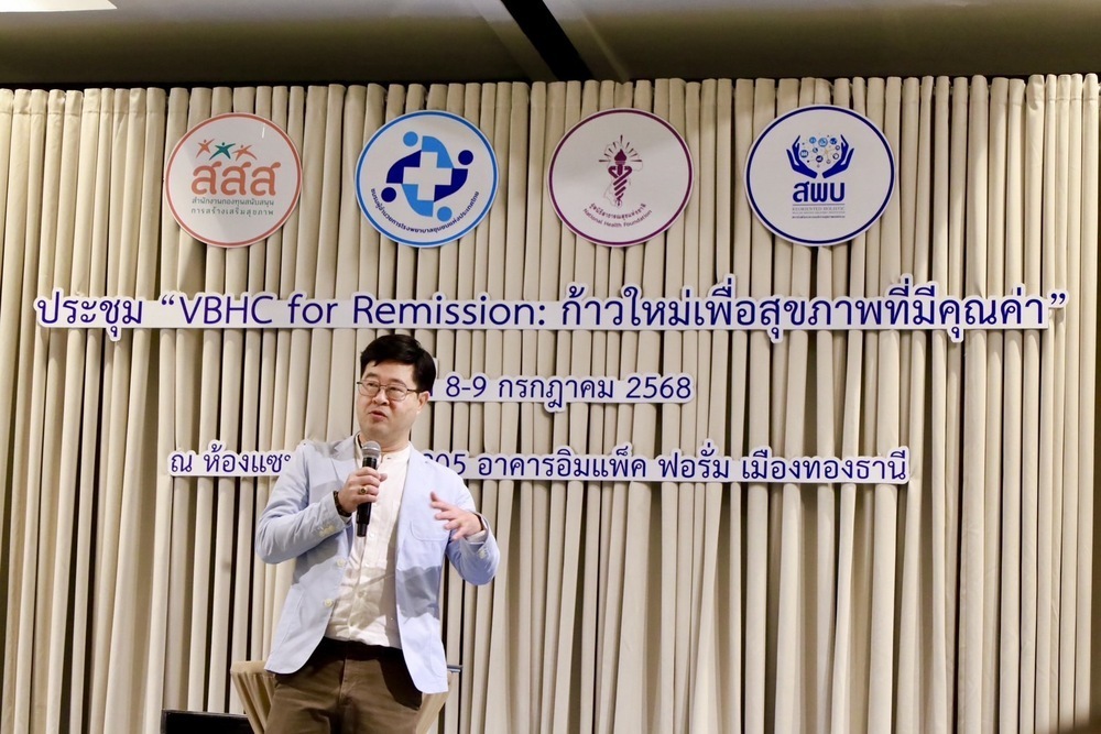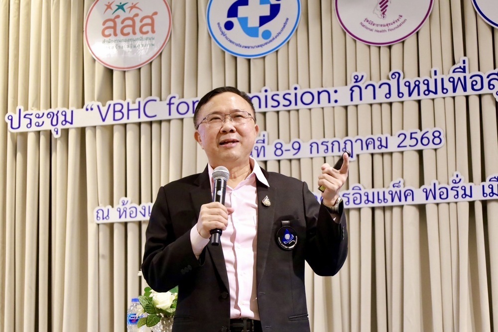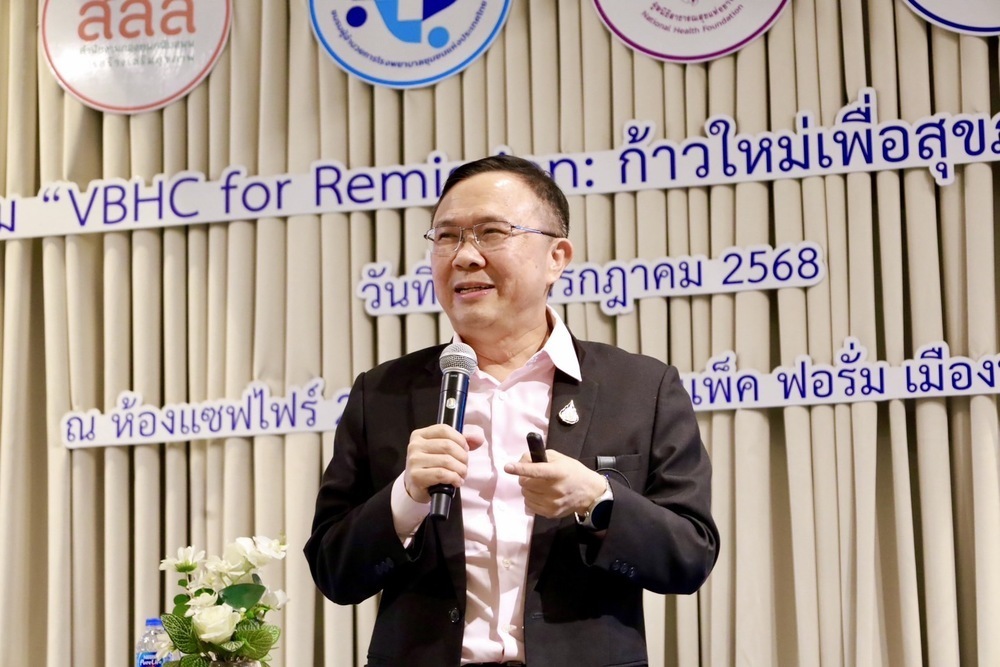 นพ.ศุภกิจ ศิริลักษณ์ ผู้อำนวยการสถาบันวิจัยระบบสาธารณสุข เปิดการประชุม "VBHC for Remission: ก้าวใหม่เพื่อสุขภาพที่มีค่า” พร้อมบรรยายพิเศษหัวข้อ “VBHC ทางออกของระบบสุขภาพไทย กับ DM Remission” ซึ่งเป็นการประชุมภายใต้โครงการพัฒนาศูนย์รียนรู้เพื่อการขยายผลในโรงพยาบาลชุมชนและศูนย์สุขภาพชุมชนเขตเมือง เพื่อส่งเสริมการปรับเปลี่ยนพฤติกรรมสุขภาพสำหรับผู้ป่วยเบาหวาน โดยเน้นภาวะโรคสงบ (DM Remission) และการควบคุมน้ำหนักตัว บนฐานแนวคิดการจัดบริการแบบมุ่งเน้นคุณค่า (Value-based Health Care: VBHC) ที่เน้นผลลัพธ์ที่ดีเมื่อเทียบกับต้นทุน และสนับสนุนให้ผู้ป่วยจัดการสุขภาพด้วยตนเอง โดยมีผู้เข้าร่วมประชุมกว่า 200 คน จากโรงพยาบาลเครือข่ายจำนวน 45 แห่ง รวมทั้งมีโรงพยาบาลต้นแบบเรื่อง DM Remission ร่วมแบ่งปันประสบการณ์และจุดประกายแนวทางสร้างการดูแลเบาหวานแนวใหม่ เช่น รพ.สมเด็จพระยุพราชกระนวน จ.ขอนแก่น รพ.บางบางระกำ จ.พิษณุโลก รพ.เพชรบูรณ์ รพ.กาญจนดิษฐ์ จ.สุราษฎร์ธานี รพ.ท่าวุ้ง จ.ลพบุรี ฯลฯ เมื่อวันที่ 8 ก.ค. 2568 ณ ห้องแซฟไฟร์ 204-205 อาคารอิมแพ็ค ฟอรั่ม เมืองทองธานี