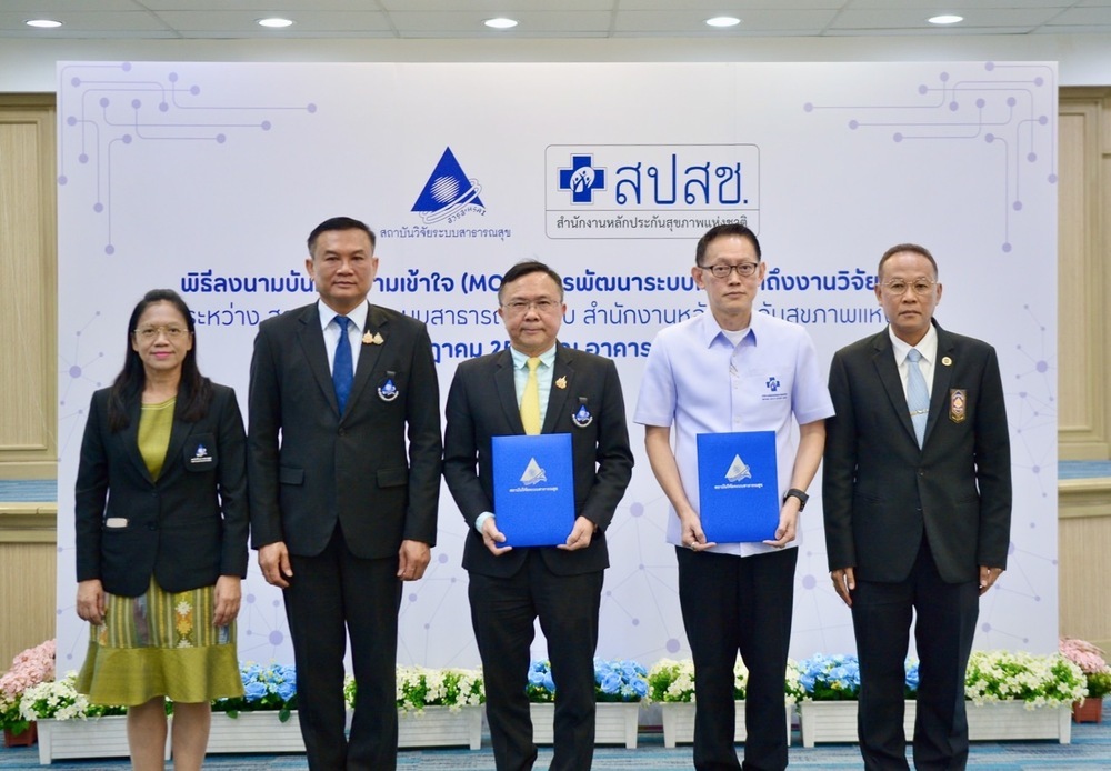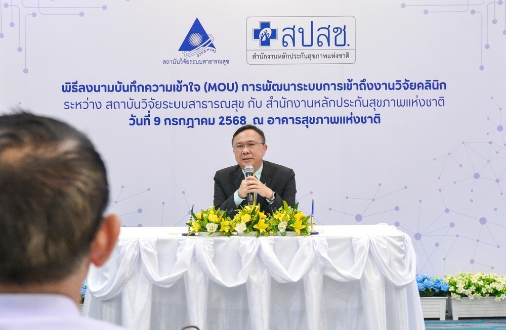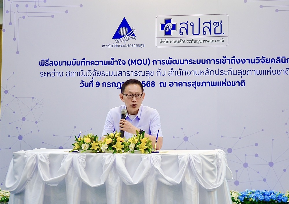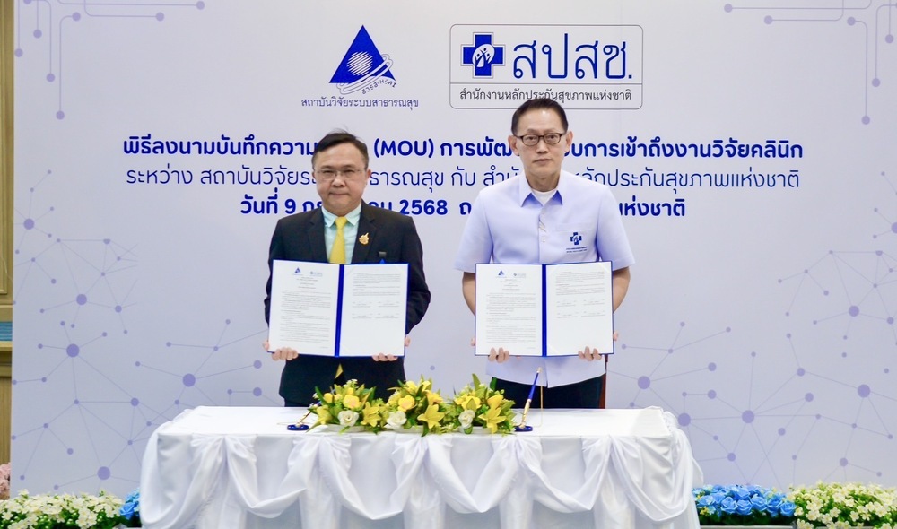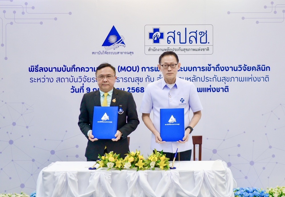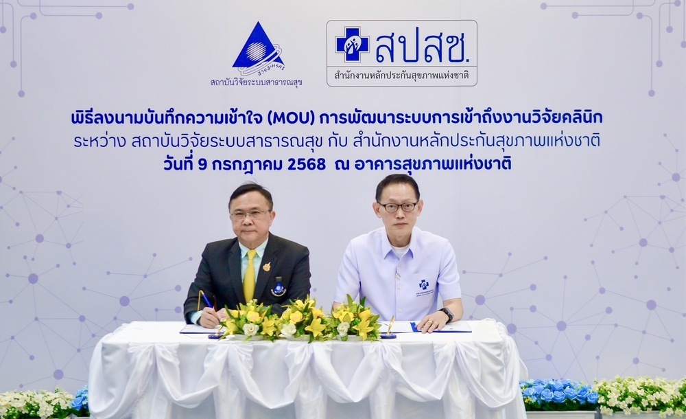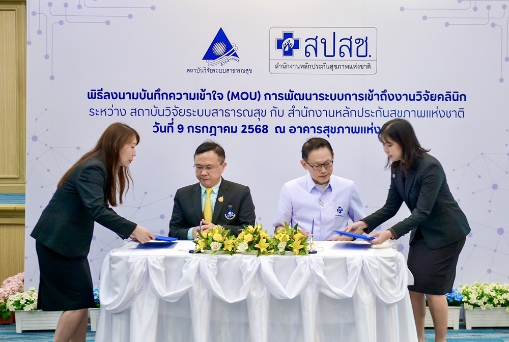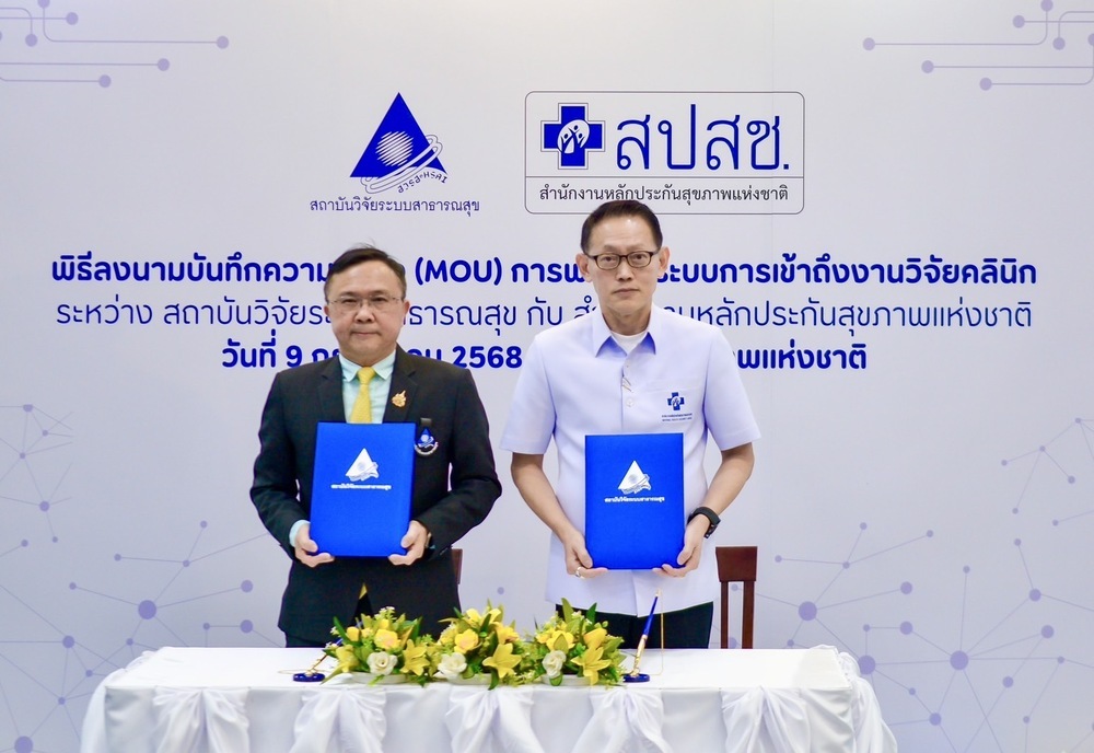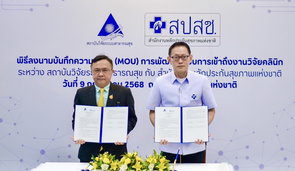 สถาบันวิจัยระบบสาธารณสุข (สวรส.) โดย นพ.ศุภกิจ ศิริลักษณ์ ผอ.สวรส. และสำนักงานหลักประกันสุขภาพแห่งชาติ (สปสช.) โดย นพ.จเด็จ ธรรมธัชอารี เลขาธิการ สปสช. เล็งเห็นความสำคัญจึงร่วมลงนาม “บันทึกความเข้าใจ (MOU) เรื่อง การพัฒนาระบบการเข้าถึงงานวิจัยคลินิก” เพื่อพัฒนาระบบการเข้าถึงยา วัคซีน และเวชภัณฑ์ทางการแพทย์ใหม่ ตั้งแต่ระยะที่อยู่ระหว่างการศึกษาวิจัยคลินิก (clinical trial) จนกระทั่งได้รับการขึ้นทะเบียน โดยมี นพ.สุระ วิเศษศักดิ์ รองผู้อำนวยการ สวรส. ผศ.ดร.จรวยพร ศรีศศลักษณ์ รองผู้อำนวยการ สวรส. และนายประเทือง เผ่าดิษฐ์ ผู้ช่วยเลขาธิการ สปสช. ร่วมเป็นสักขีพยานในพิธีลงนาม เมื่อวันที่ 9 ก.ค. 2568 ณ ห้องประชุมสานใจ 1/1 ชั้น 6 อาคารสุขภาพแห่งชาติ