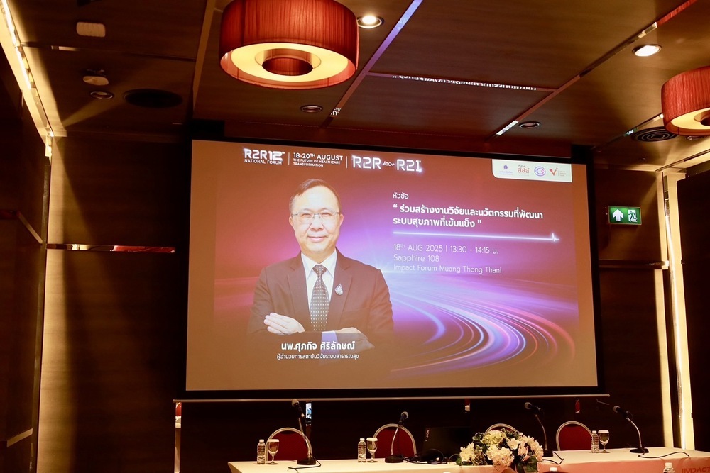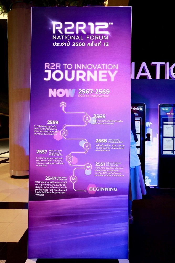 ในการประชุมแลกเปลี่ยนเรียนรู้ มหกรรม R2R National Forum ครั้งที่ 12 ประจำปี 2568 ภายใต้แนวคิด “จุดประกายการเปลี่ยนแปลงสู่อนาคตระบบสาธารณสุขที่ยั่งยืน” (The Future of Healthcare Transformation) เพื่อแลกเปลี่ยนความรู้และประสบการณ์เกี่ยวกับการพัฒนางานประจำสู่งานวิจัย (R2R) และต่อยอดงานวิจัย R2R สู่การสร้างนวัตกรรมระดับประเทศ ตลอดจนเพื่อสร้างเครือข่ายงานวิจัย R2R และเผยแพร่แนวคิด ตลอดจนประโยชน์ของการทำ R2R ให้แพร่หลาย โดยมีผู้เข้าร่วมประชุมที่เป็นเครือข่าย R2R จากทั่วประเทศ ทั้งบุคลากรทางการแพทย์และสาธารณสุข บุคลากรจากสถาบันการศึกษา มาร่วมแลกเปลี่ยนเรียนรู้และนำเสนอผลงานวิจัยเด่น R2R ระหว่างวันที่ 18 - 20 ส.ค. 2568 ณ อิมแพ็ค ฟอรั่ม เมืองทองธานี