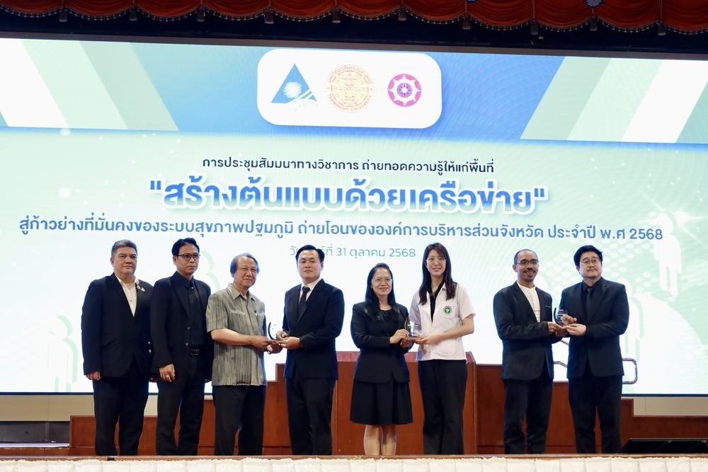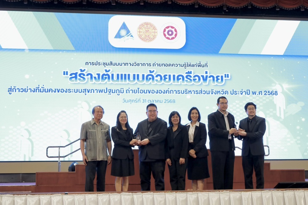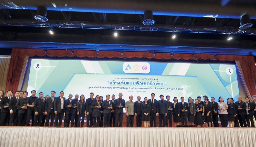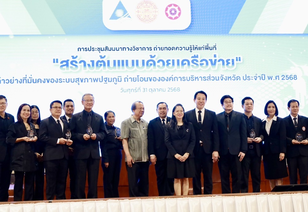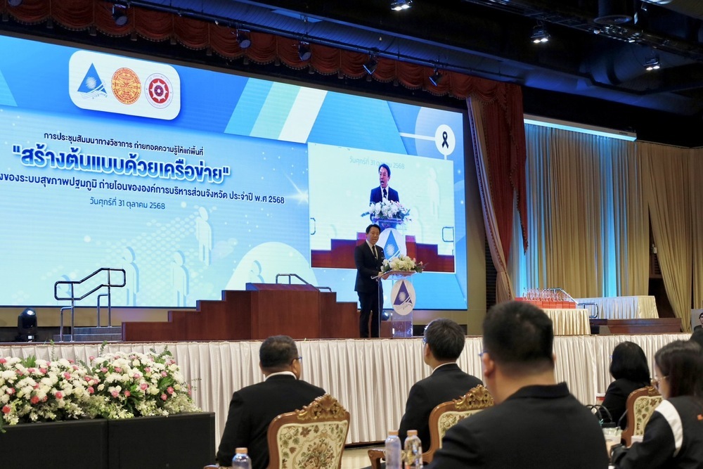 สถาบันวิจัยระบบสาธารณสุข (สวรส.) จึงร่วมกับวิทยาลัยสหวิทยาการ มหาวิทยาลัยธรรมศาสตร์ และคณะรัฐประศาสนศาสตร์ สถาบันบัณฑิตพัฒนบริหารศาสตร์ จัดการประชุมสัมมนาทางวิชาการส่งคืนข้อมูลและถ่ายทอดความรู้ให้แก่พื้นที่ “สร้างต้นแบบด้วยเครือข่าย สู่ก้าวย่างที่มั่นคงของระบบสุขภาพปฐมภูมิ” ภายใต้โครงการศึกษาวิจัยขับเคลื่อนการนำผลงานวิจัยไปใช้ประโยชน์ การขยายผลแนวทางการจัดบริการสุขภาพปฐมภูมิภายใต้สังกัดองค์การบริหารส่วนจังหวัด เพื่อแลกเปลี่ยนเรียนรู้และถ่ายทอดประสบการณ์การจัดบริการสุขภาพปฐมภูมิแบบบูรณาการของ อบจ. และหน่วยงานสังกัดกระทรวงสาธารณสุขใน 10 จังหวัด ได้แก่ ขอนแก่น ชลบุรี มุกดาหาร สมุทรสาคร นราธิวาส พิจิตร ศรีสะเกษ ยะลา สงขลา ปทุมธานี ซึ่งเป็นพื้นที่ต้นแบบในโครงการศึกษาวิจัยฯ ที่ขยายผลมาจากระยะแรก 11 จังหวัด และส่งคืนข้อมูลผลการศึกษาวิจัย ตลอดจนผลการติดตามประเมินผลที่ครอบคลุมทุกมิติ รวมทั้งผลการถอดบทเรียนกระบวนการเรียนรู้ที่ได้จากการประเมินเชิงพัฒนา (Developmental Evaluation: DE) เพื่อให้ อบจ. และหน่วยงานในสังกัดกระทรวงสาธารณสุขในพื้นที่ 10 จังหวัด นำไปเป็นแนวทางการเพิ่มประสิทธิภาพการทำงานเชิงบูรณาการในระยะต่อไป ซึ่งเป็นส่วนหนึ่งของการนำงานวิจัยไปใช้ประโยชน์ ควบคู่กับการเสริมองค์ความรู้และพัฒนาศักยภาพผู้ปฏิบัติงานในพื้นที่ไปในเวลาเดียวกัน ทั้งนี้ในเวทีประชุมสัมมนาฯ ได้รับเกียรติจาก นพ.โอชิษฐ์ เกียรติก้องชูชัย สมาชิกสภาผู้แทนราษฎร ประธานกรรมาธิการสาธารณสุข สภาผู้แทนราษฎร และนายสมพร ใช้บางยาง ประธานอนุกรรมการบริหารภารกิจถ่ายโอนด้านสาธารณสุขให้แก่องค์กรปกครองส่วนท้องถิ่น (อปท.) และกรรมการผู้ทรงคุณวุฒิในคณะกรรมการกระจายอำนาจให้แก่ อปท. เป็นประธานในพิธีเปิด รวมทั้งผู้ทรงคุณวุฒิที่มีส่วนในการขับเคลื่อนการกระจายอำนาจด้านสุขภาพของประเทศ อาทิ นายศิริพันธ์ ศรีกงพลี รองอธิบดีกรมส่งเสริมการปกครองท้องถิ่น ผศ.ดร.จรวยพร ศรีศศลักษณ์ รองผู้อำนวยการ สวรส. นพ.โกเมนทร์ ทิวทอง รองผู้อำนวยการกองสนับสนุนระบบสุขภาพปฐมภูมิ สำนักงานปลัดกระทรวงสาธารณสุข นพ.พงศ์เทพ วงศ์วัชรไพบูลย์ ผู้จัดการกองทุนสนับสนุนการสร้างเสริมสุขภาพ ฯลฯ และมีผู้บริหาร ผู้ปฏิบัติงานในพื้นที่ทั้งจากสังกัด อปท. และหน่วยงานด้านสาธารณสุข ร่วมสัมมนากว่า 500 คน เมื่อวันที่ 31 ต.ค. 2568 ณ หอประชุมเฉลิมพระเกียรติ 6 รอบ พระชนมพรรษา สถาบันบัณฑิตพัฒนบริหารศาสตร์ (นิด้า)