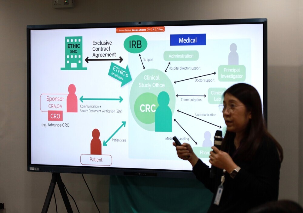 📍 นพ.ศุภกิจ ศิริลักษณ์ ผอ.สวรส กล่าวถึงประเด็นสำคัญว่า แม้ศูนย์วิจัยคลินิกในประเทศไทยยังมีจำนวนน้อย แต่มีความพร้อมด้านจำนวนผู้ป่วยสูง (การใช้บริการ OPD ~300 ล้านครั้ง , IPD ~ 7 ล้านคน ) จึงจำเป็นต้องสร้างระบบนิเวศ (ecosystem) ที่เอื้อต่อการตั้งศูนย์วิจัยคลินิก ซึ่งจะช่วยสร้างรายได้ให้กับโรงพยาบาล และส่งผลดีต่อระบบสุขภาพโดยรวม ซึ่ง สวรส.จะทำหน้าที่เป็นตัวกลางในการประสานความร่วมมือระหว่างมหาวิทยาลัย โรงพยาบาลในสังกัดกระทรวงสาธารณสุข และภาคเอกชน รวมถึงหน่วยงานสำคัญอย่างเช่น อย. และสภาวิชาชีพต่างๆ เพื่อร่วมกันพัฒนาระบบวิจัยคลินิก โดยมีเป้าหมายให้ผู้ป่วยได้รับการรักษาด้วยยาใหม่โดยไม่เสียค่าใช้จ่าย