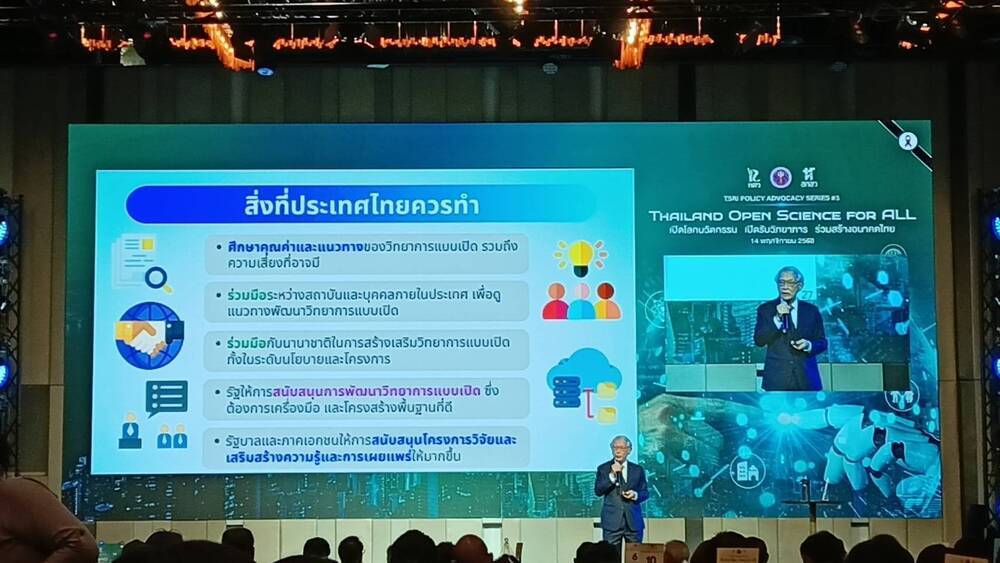 ภายในงาน ศ.ดร.นพ.สิริฤกษ์ ทรงศิวิไล ประธานกรรมการส่งเสริมวิทยาศาสตร์ วิจัยและนวัตกรรม (กสว.) ได้กล่าวเปิดงาน พร้อมเน้นถึงความสำคัญของการขับเคลื่อน Open Science ว่าเป็นรากฐานของการพัฒนาคุณภาพงานวิจัยและการเข้าถึงองค์ความรู้ของสังคม โดยกล่าวว่า “Open Science ไม่ได้เป็นเพียงแนวโน้มระดับสากล แต่เป็นกลไกสำคัญที่ทำให้ประเทศสามารถใช้ประโยชน์จากงานวิจัยได้อย่างเต็มศักยภาพ เปิดโอกาสให้ทุกภาคส่วนเข้าถึงข้อมูลและนวัตกรรมอย่างเท่าเทียม และสร้างคุณค่าร่วมให้สังคมไทยเดินหน้าไปด้วยกัน”