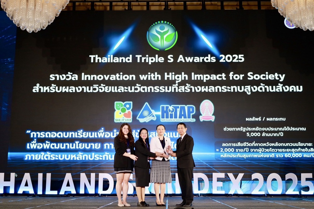 สถาบันวิจัยระบบสาธารณสุข (สวรส.) โดย นพ.ศุภกิจ ศิริลักษณ์ ผู้อำนวยการสถาบันวิจัยระบบสาธารณสุข และ ผศ.ดร.จรวยพร ศรีศศลักษณ์ รองผู้อำนวยการสถาบันวิจัยระบบสาธารณสุข รับมอบรางวัลเชิดชูเกียรติหน่วยงานผู้ขับเคลื่อนการใช้ประโยชน์ผลงาน ววน. ดีเด่น (Best Organization for Research Intermediary Awards) สำหรับหน่วยงานบริหารจัดการและจัดการทุนวิจัยที่มีภาพรวมในการขับเคลื่อนการใช้ประโยชน์ผลงานวิจัยและนวัตกรรมที่สร้างผลกระทบสูงด้านนโยบาย และผลงานวิจัยที่ได้รับทุนสนับสนุนจาก สวรส. เรื่อง “การถอดบทเรียนเพื่อนำไปสู่ข้อเสนอแนะเพื่อพัฒนานโยบาย การบำบัดทดแทนไต ภายใต้ระบบหลักประกันสุขภาพแห่งชาติ” ได้รับรางวัล Innovation with High Impact for Society ซึ่งเป็นงานวิจัยและนวัตกรรมที่สร้างผลกระทบสูงด้านสังคม สามารถช่วยประหยัดงบประมาณได้ประมาณ 5,000 ล้านบาท/ปี ลดการเสียชีวิตที่คาดหวังหลังทบทวนนโยบาย ประมาณ 2,000 ราย/ปี จากผู้ป่วยไตวานระยะสุดท้ายในสิทธิหลักประกันสุขภาพแห่งชาติ ราว 60,000 คน/ปี ทั้งนี้รางวัลดังกล่าวมอบโดยศาสตราจารย์สิริฤกษ์ ทรงศิวิไล ประธานกรรมการส่งเสริมวิทยาศาสตร์ วิจัยและนวัตกรรม และจัดพิธีมอบรางวัลขึ้นภายในงาน “ทิศทางวิจัย x นวัตกรรมไทย 2569 : Thailand SRI Index 2025” จัดโดยสำนักงานคณะกรรมการคณะกรรมการส่งเสริมวิทยาศาสตร์ วิจัยและนวัตกรรม (สกสว.) เมื่อวันที่ 4 ธ.ค. 2568 ณ ห้องนภาลัย โรงแรมดุสิตธานี
