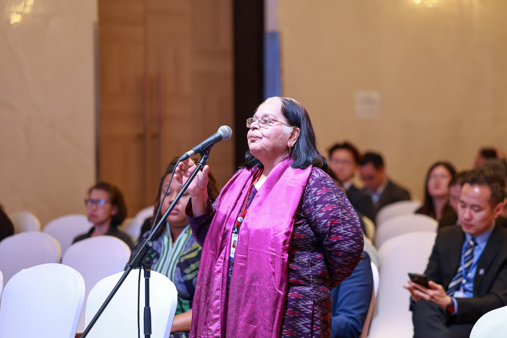 ต่อมา Dr. Renu Khanna จากประเทศอินเดีย สะท้อนภาพความเป็นจริงของผู้หญิงและกลุ่มคนชายขอบในเอเชียใต้ โดยชี้ให้เห็นอุปสรรคสำคัญจากภาพประกอบการนำเสนอว่า