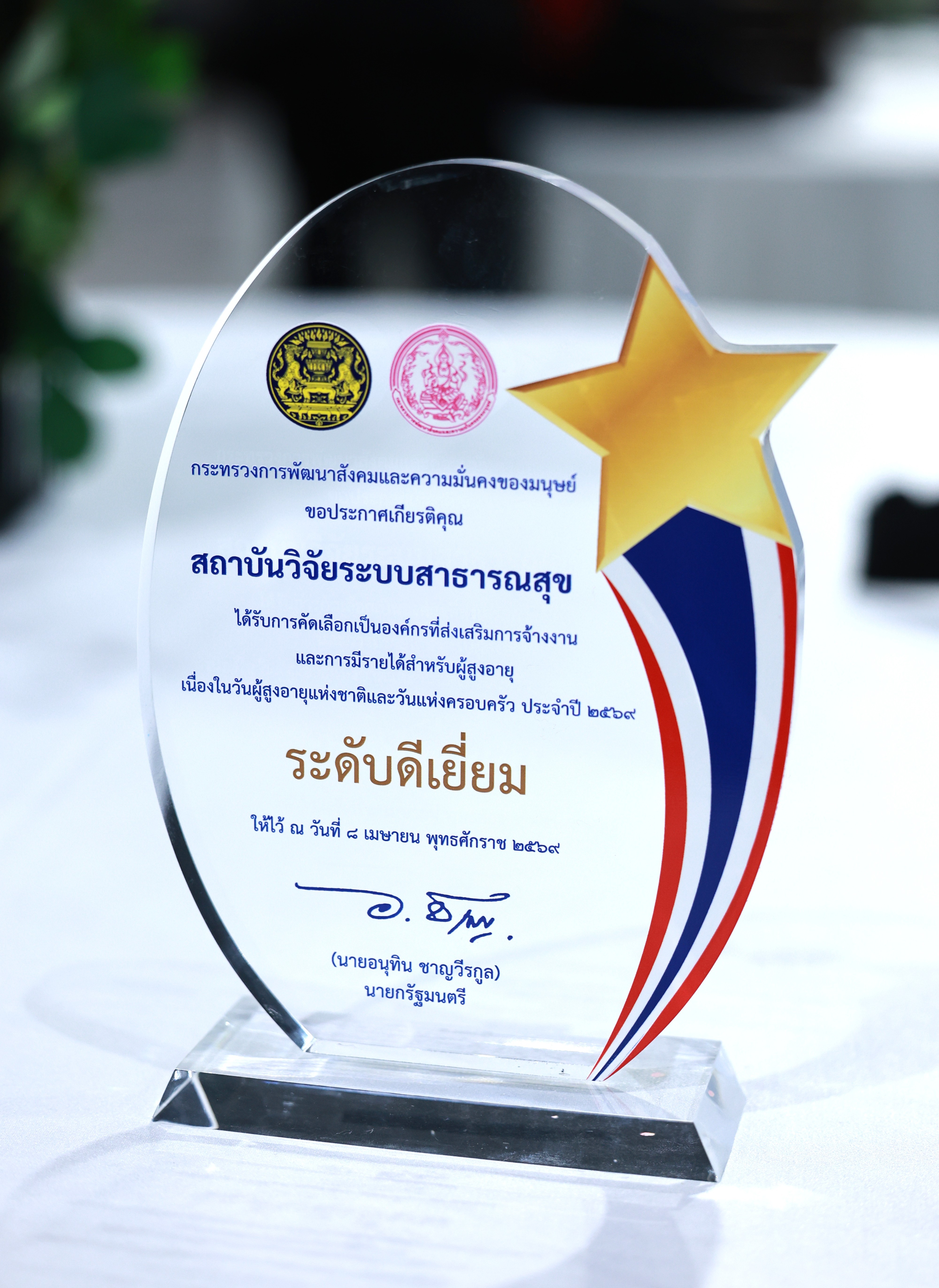 📌 วันนี้ 8 เม.ย. 69 : สถาบันวิจัยระบบสาธารณสุข (สวรส.) ร่วมเป็นเกียรติในการรับโล่ประกาศเกียรติคุณ ในงานวันผู้สูงอายุแห่งชาติและวันแห่งครอบครัว ประจำปี 2569 ภายใต้แนวคิด “ก้ม กราบ กอดผู้สูงวัย สร้างครอบครัวไทยเข้มแข็ง” โดยมี นายกันตพงศ์ รังษีสว่าง ปลัดกระทรวงการพัฒนาสังคมและความมั่นคงของมนุษย์เป็นผู้มอบโล่รางวัลฯ และนายธีรธัช กันตามระ ผู้ช่วยผู้อำนวยการ สวรส. เป็นตัวแทนของหน่วยงาน ในการขึ้นรับ “รางวัลองค์กรที่ส่งเสริมการจ้างงานและการมีรายได้สำหรับผู้สูงอายุ เนื่องในวันผู้สูงอายุแห่งชาติ ประจำปี 2569 ระดับดีเยี่ยม”