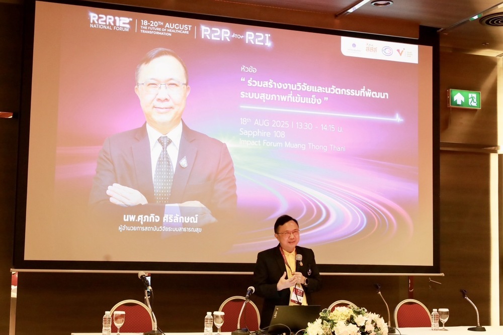 ในการประชุมแลกเปลี่ยนเรียนรู้ มหกรรม R2R National Forum ครั้งที่ 12 ประจำปี 2568 ภายใต้แนวคิด “จุดประกายการเปลี่ยนแปลงสู่อนาคตระบบสาธารณสุขที่ยั่งยืน” (The Future of Healthcare Transformation) เพื่อแลกเปลี่ยนความรู้และประสบการณ์เกี่ยวกับการพัฒนางานประจำสู่งานวิจัย (R2R) และต่อยอดงานวิจัย R2R สู่การสร้างนวัตกรรมระดับประเทศ ตลอดจนเพื่อสร้างเครือข่ายงานวิจัย R2R และเผยแพร่แนวคิด ตลอดจนประโยชน์ของการทำ R2R ให้แพร่หลาย โดยมีผู้เข้าร่วมประชุมที่เป็นเครือข่าย R2R จากทั่วประเทศ ทั้งบุคลากรทางการแพทย์และสาธารณสุข บุคลากรจากสถาบันการศึกษา มาร่วมแลกเปลี่ยนเรียนรู้และนำเสนอผลงานวิจัยเด่น R2R ระหว่างวันที่ 18 - 20 ส.ค. 2568 ณ อิมแพ็ค ฟอรั่ม เมืองทองธานี