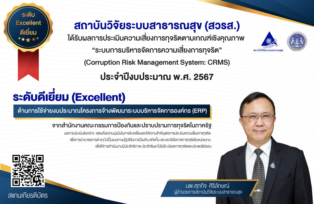 สถาบันวิจัยระบบสาธารณสุข (สวรส.) ได้รับผลการประเมินความเสี่ยงการทุจริตตามเกณฑ์เชิงคุณภาพ "ระบบการบริหารจัดการความเสี่ยงการทุจริต" (Corruption Risk Management System: CRMS) ประจำปีงบประมาณ พ.ศ. 2567 ระดับดีเยี่ยม (Excellent) ด้านการใช้จ่ายงบประมาณโครงการจ้างพัฒนาระบบบริหารจัดการองค์กร (ERP) จากสำนักงานคณะกรรมการป้องกันและปราบปรามการทุจริตในภาครัฐ ผลการประเมินดังกล่าว แสดงถึงความมุ่งมั่นในการขับเคลื่อนและให้ความสำคัญต่อการประเมินความเสี่ยงการทุจริต เพื่อการนำมาตรการต่างๆ ไปเป็นแนวทางปฏิบัติในการป้องกัน สกัดกั้น ลด และปิดโอกาสการทุจริตในหน่วยงาน เพื่อให้การดำเนินงานมีประสิทธิภาพ ประสิทธิผล โปร่งใส ปลอดการทุจริตและประพฤติมิชอบ