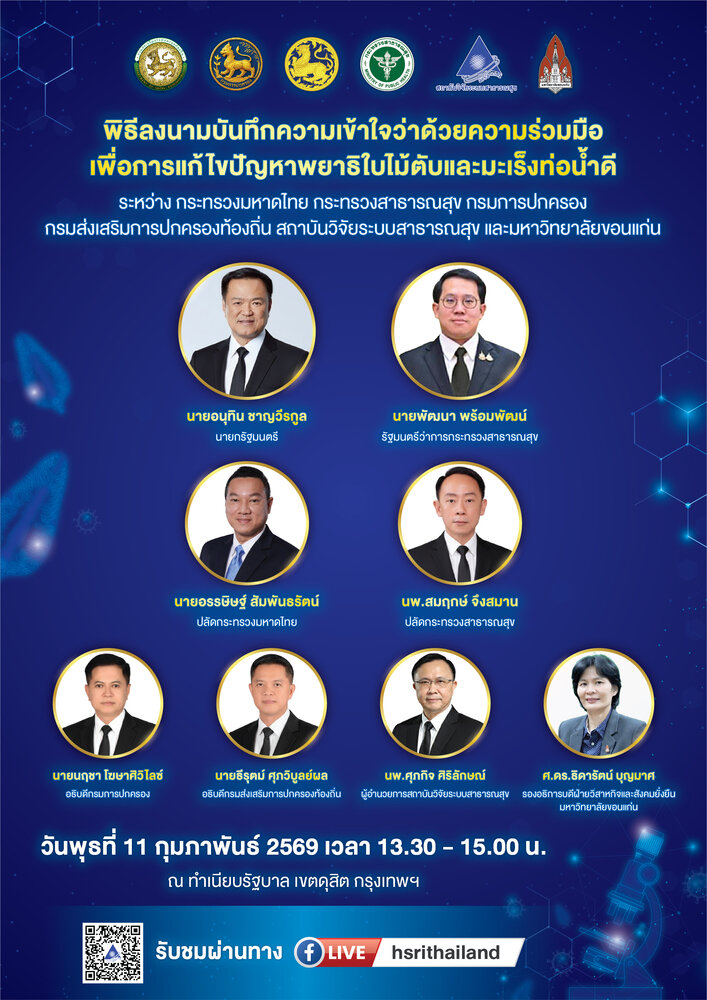 การประชุมคณะทำงานติดตามและประเมินผลกระทบของการขยายเวลาจำหน่ายเครื่องดื่มแอลกอฮอล์ ครั้งที่ 1/2569 สถาบันวิจัยระบบสาธารณสุข (สวรส.) โดย ผศ.ดร.จรวยพร ศรีศศลักษณ์ รองผู้อำนวยการ สวรส. และทีมวิจัยจากมูลนิธิเพื่อการประเมินเทคโนโลยีและนโยบายด้านสุขภาพ (HITAP) ได้รายงานความคืบหน้างานวิจัยเรื่อง “การสังเคราะห์หลักฐานเพื่อการตัดสินใจเชิงนโยบายจากการประเมินผลกระทบของการขยายเวลาจำหน่ายเครื่องดื่มแอลกฮออล์ 180 วัน ในประเทศไทย” เพื่อหารือกรอบการประเมินผลกระทบในเรื่องดังกล่าว ให้มีความชัดเจนมากยิ่งขึ้น และขอความร่วมมือด้านข้อมูลจากหน่วยงานต่างๆ ที่เกี่ยวข้อง อาทิ ฐานข้อมูล HDC ของกระทรวงสาธารณสุข ฐานข้อมูลของสำนักงานหลักประกันสุขภาพแห่งชาติ (สปสช.) กรมบัญชีกลาง สำนักงานประกันสังคม กรมสรรพสามิต สำนักงานตำรวจแห่งชาติ กรมการปกครอง กองเศรษฐกิจการท่องเที่ยวและกีฬา ภาคธุรกิจ ห้างสรรพสินค้า ร้านสะดวกซื้อ ฯลฯ รวมถึงระยะเวลาในการดำเนินงานวิจัย โดยมี นพ.สมฤกษ์ จึงสมาน ปลัดกระทรวงสาธารณสุข เป็นประธานการประชุม พร้อมด้วย นพ.มณเฑียร คณาสวัสดิ์ อธิบดีกรมควบคุมโรค และคณะทำงานติดตามและประเมินผลกระทบฯ ซึ่งเป็นผู้แทนจากหน่วยงานเกี่ยวของกับเรื่องดังกล่าว ณ ห้องประชุม 2 ชั้น 2 อาคาร 1 สำนักงานปลัดกระทรวงสาธารณสุข