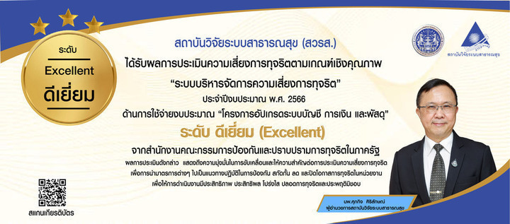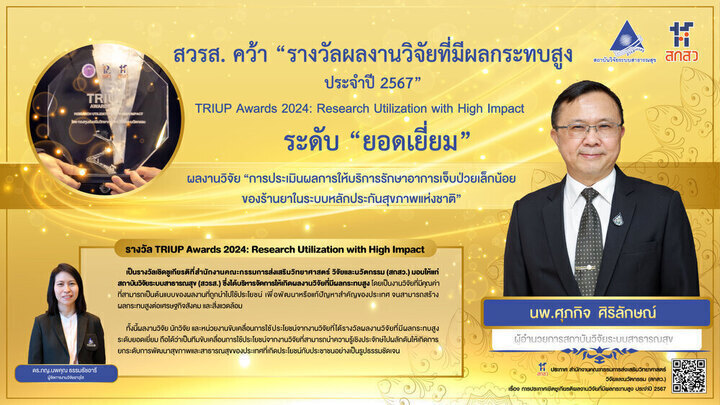 สวรส. คว้า “รางวัลผลงานวิจัยที่มีผลกระทบสูง ประจำปี 2567” TRIUP Awards 2024: Research Utilization with High Impact ระดับ “ยอดเยี่ยม” ผลงานวิจัย “การประเมินผลการให้บริการรักษาอาการเจ็บป่วยเล็กน้อยของร้านยาในระบบหลักประกันสุขภาพแห่งชาติ”