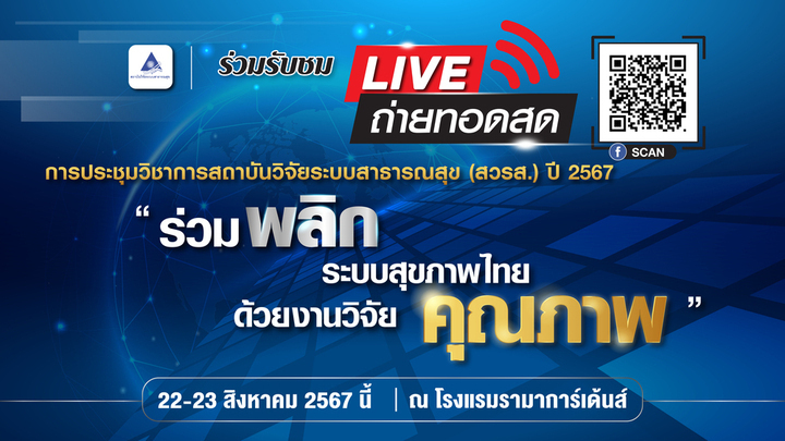 สถาบันวิจัยระบบสาธารณสุข (สวรส.) ร่วมกับภาคีเครือข่าย จัดการประชุมวิชาการสถาบันวิจัยระบบสาธารณสุข (สวรส.) ปี 2567 “ร่วมพลิกระบบสุขภาพไทย ด้วยงานวิจัยคุณภาพ” ระหว่างวันที่ 22-23 ส.ค. 2567 เพื่อเป็นเวทีแลกเปลี่ยนเรียนรู้ประสบการณ์ในการนำผลงานวิจัยระบบสุขภาพไปใช้ประโยชน์ รวมถึงมุ่งส่งเสริมให้ประเทศไทยมีนโยบายสำคัญด้านระบบสาธารณสุขที่เกิดจากงานวิจัยคุณภาพ โดยมีเครือข่ายนักวิจัย บุคลากรสาธารณสุข รวมทั้งภาคส่วนต่างๆ ที่สนใจเข้าร่วมงานกว่า 500 คน