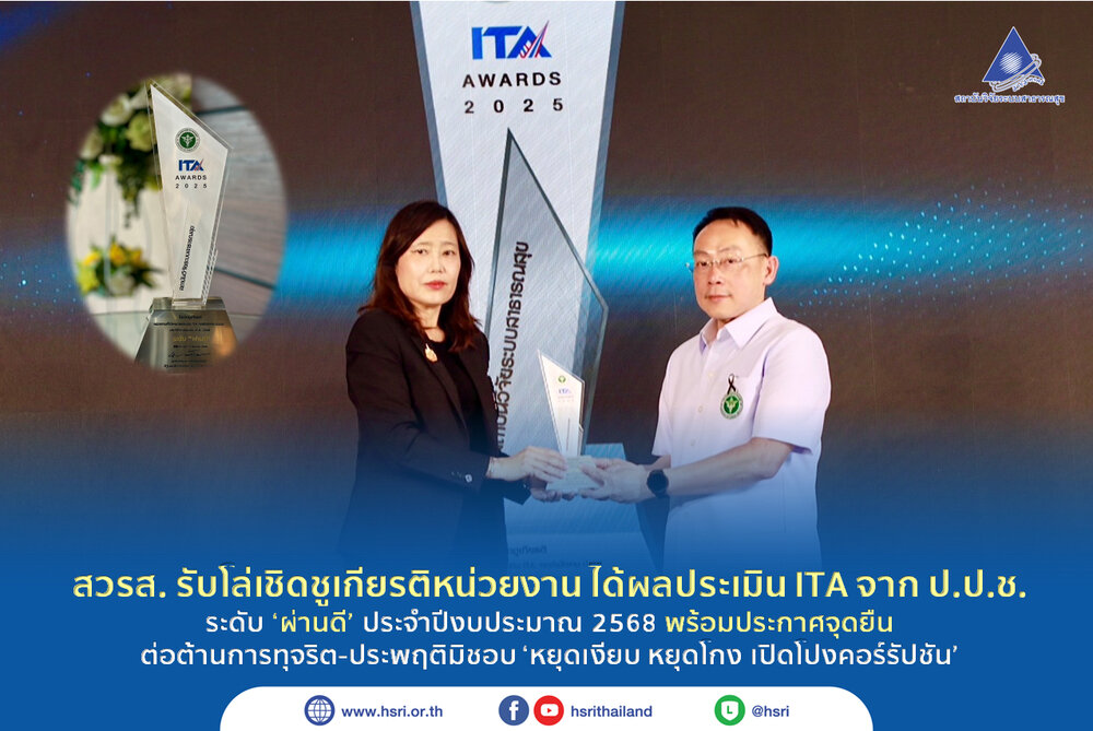 สวรส. รับโล่เชิดชูเกียรติหน่วยงาน ได้ผลประเมิน ITA จาก ป.ป.ช. ระดับ ‘ผ่านดี’ ประจำปีงบประมาณ 2568 พร้อมประกาศจุดยืน ต่อต้านการทุจริต-ประพฤติมิชอบ ‘หยุดเงียบ หยุดโกง เปิดโปงคอร์รัปชัน’